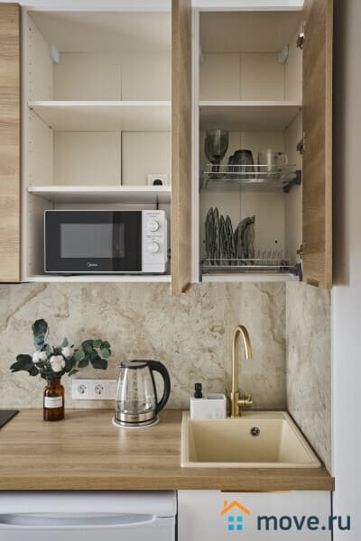 - Удобная обеденная и кухонная зона с набором посуды, плитой, микроволновой печью