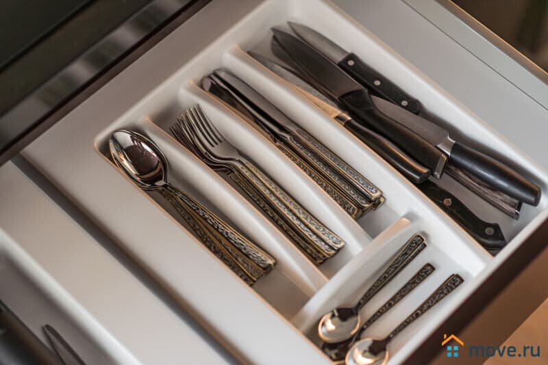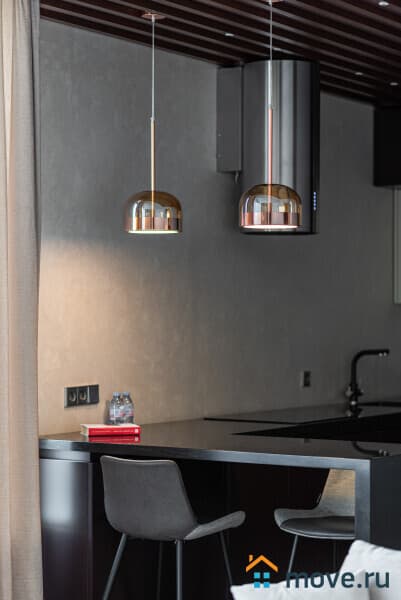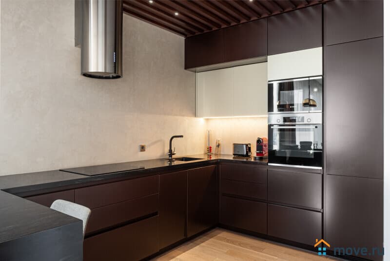 Кухня в духе современного минимализма — здесь есть всё, чтобы приготовить завтрак, ужин или просто заварить любимый чай. Варочная панель, духовка, кофемашина, чайник, посудомойка — полный фарш для поваров и не только