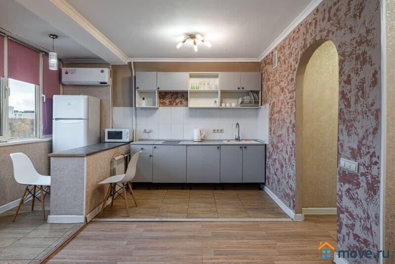 — кухня-гостиная с обеденной зоной, барной стойкой и бытовой техникой (холодильник, плита, микроволновая печь, чайник, посуда);