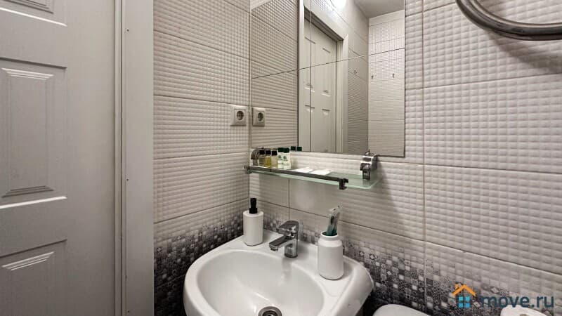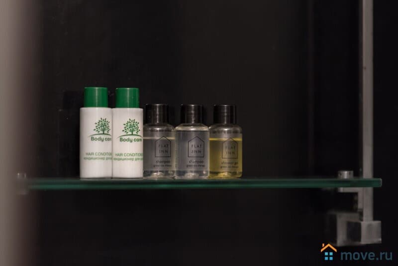 — современный санузел с душевой кабиной, стиральной машиной и косметическими наборами Flat Inn.
