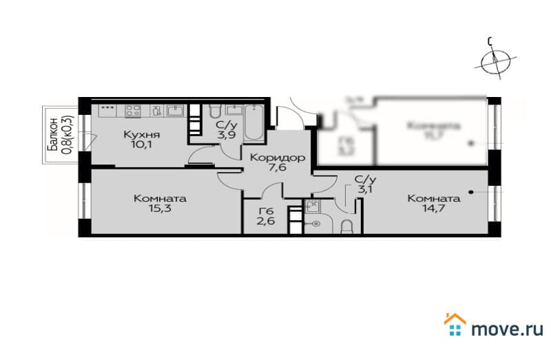 два санузла - 3,9 кв.м. и 3,1 кв.м.