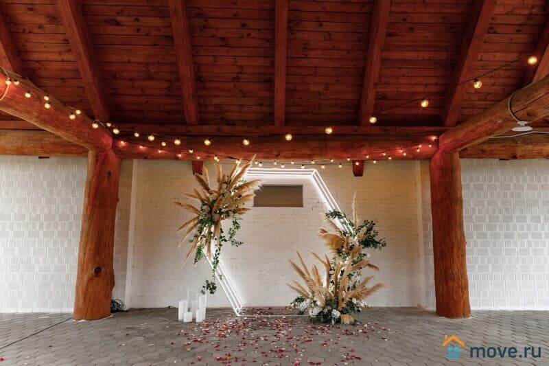 На огромном участке в 40 соток расположена беседка, которая в теплое время года используется как летний ресторан с возможностью проведения банкетов до 100 персон. Рядом с водоемом оборудована площадка для выездной регистрации.