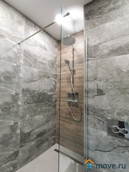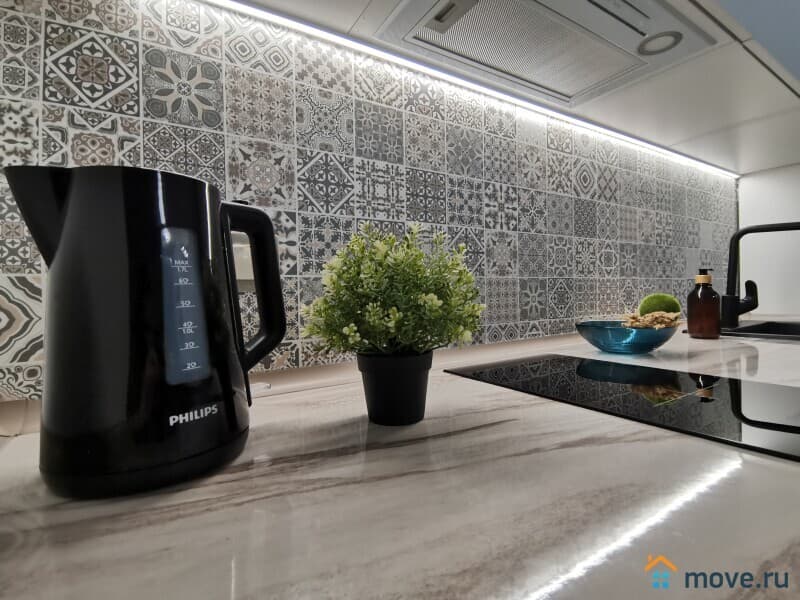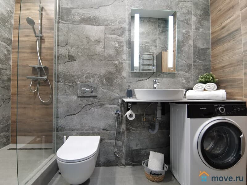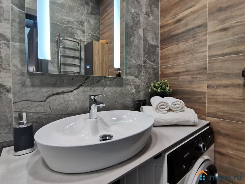 В квартире есть всё необходимое: стиральная машина, посудомоечная машина, кондиционер, телевизор, микроволновая печь, фен и пылесос.