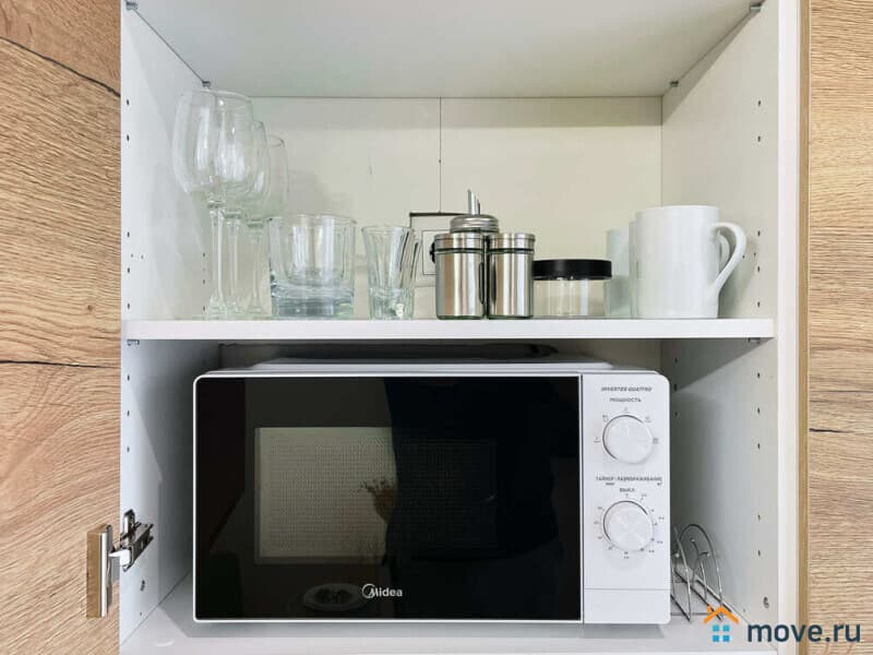 - удобная обеденная и кухонная зона с набором посуды, плитой, микроволновой печью