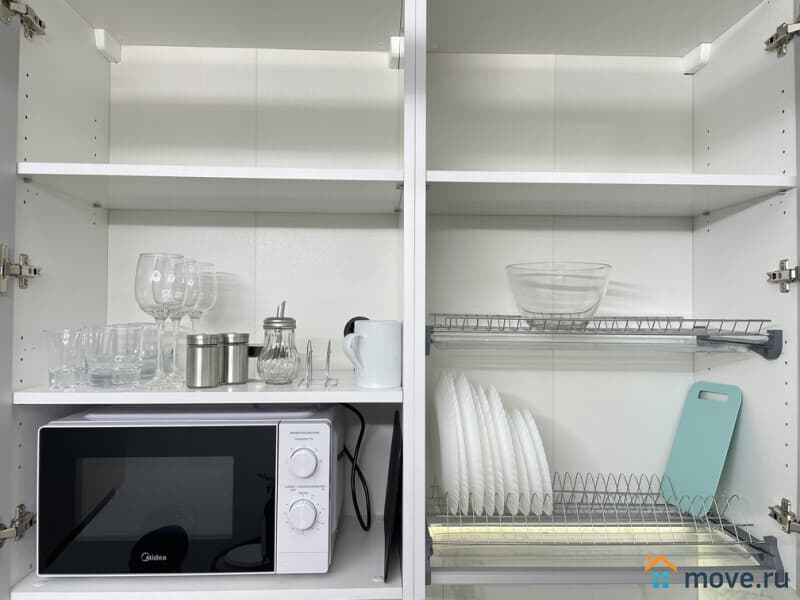- удобная обеденная и кухонная зона с набором посуды, плитой, микроволновой печью