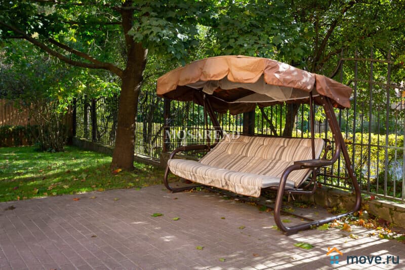 -зона барбекю с мангалом, большим столом и садовыми качелями