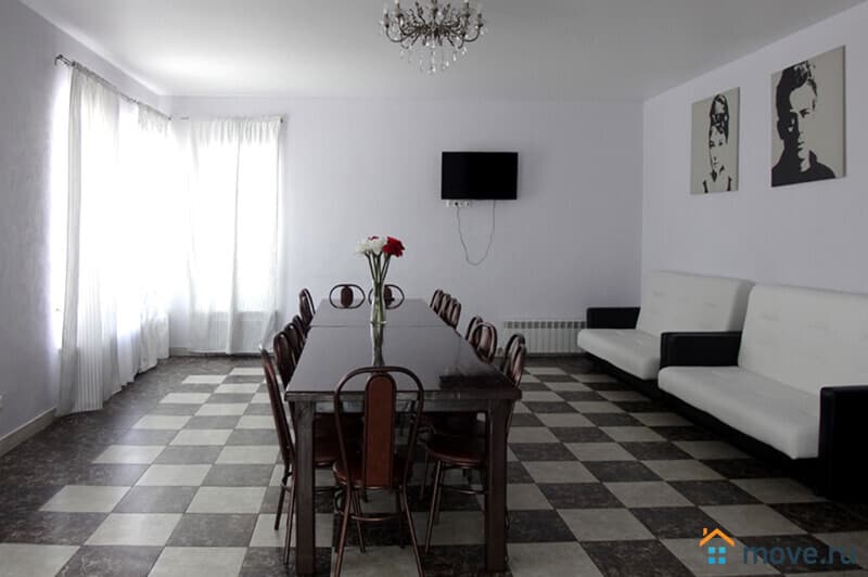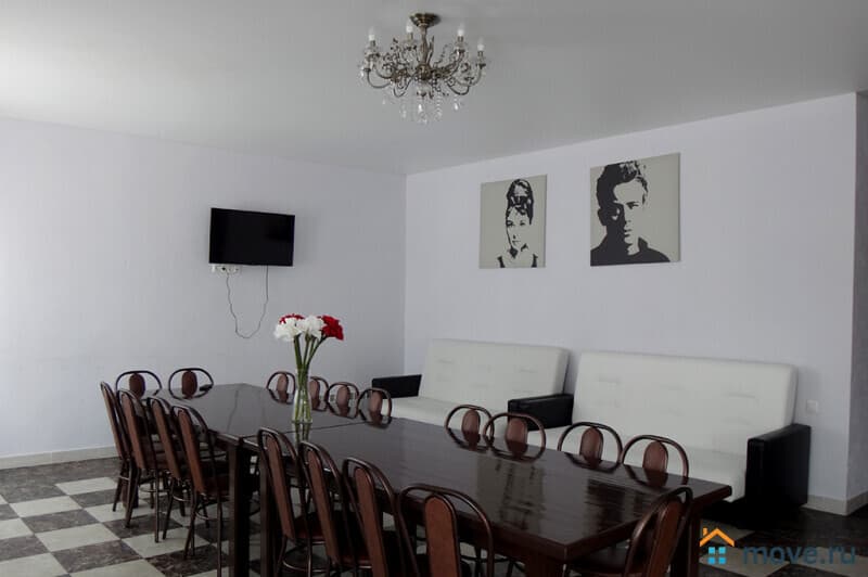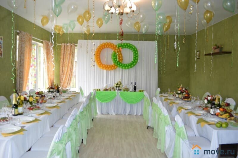 1-ый этаж — банкетный зал вместимостью 40-45 посадочных мест, кухня, оборудованная всей необходимой техникой, две изолированные комнаты, санузел. 2-ой этаж — 3 спальни, танцпол, санузел