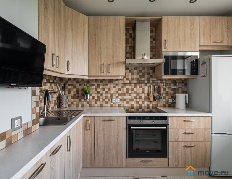 Кухня с варочной панелью, духовым шкафом, микроволновкой, чайником и вытяжкой