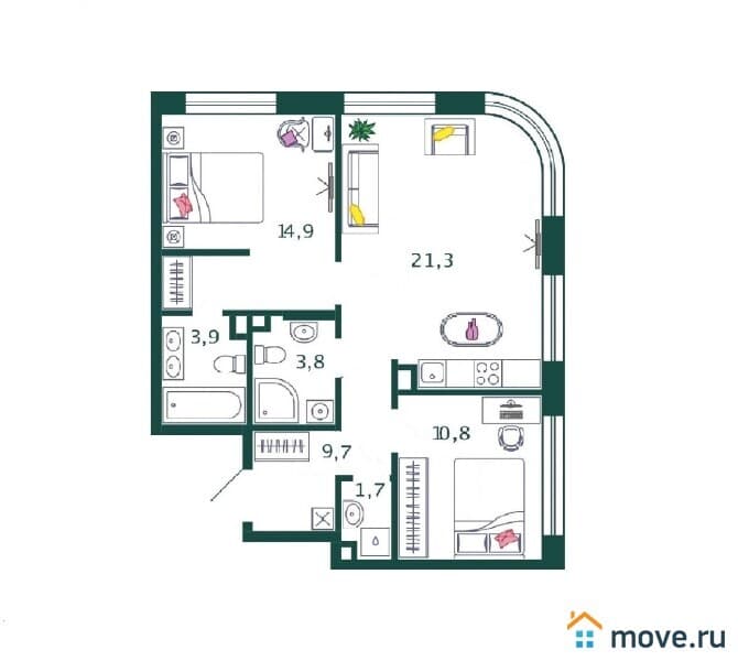 КУХНЯ-ГОСТИНАЯ 21,3м, уютные комнаты , несколько санузлов, предусмотрено место для кладовой, отдельной прачечной. Квартира может быть полноценной ТРЁХКОМНАТНОЙ квартирой с изолированными комнатами 15м, 11м и 11м, в каждой комнате будет окно. Квартира СОЛНЕЧНАЯ, светлая с красивым видом из окон. Сторона юго-восток, окна смотрят на зеленый сквер, из-за которого виднеется Москва-река. Дом расположен не на дороге, а в ТИХОМ месте.