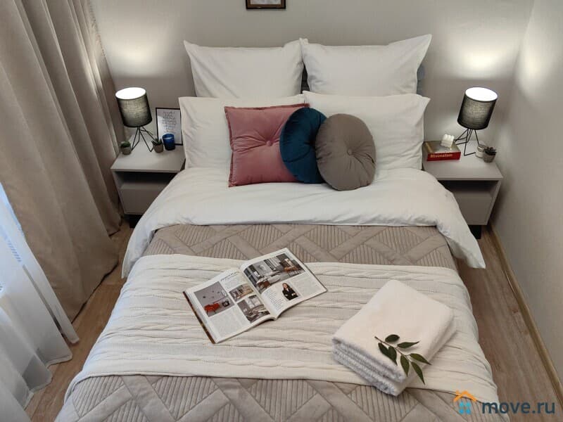 • Отдельная спальня с двуспальной кроватью, которая оснащена ортопедическим матрасом, заправлена чистым белым постельным бельем (2 спальных места).