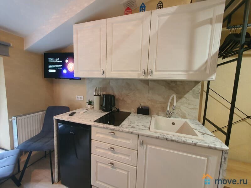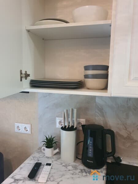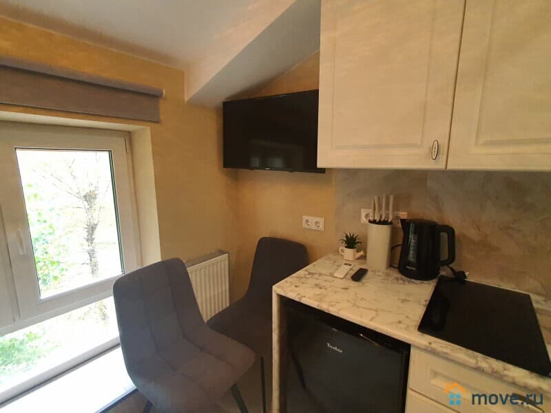 - удобная обеденная и кухонная зона с набором посуды, плитой, микроволновой печью
