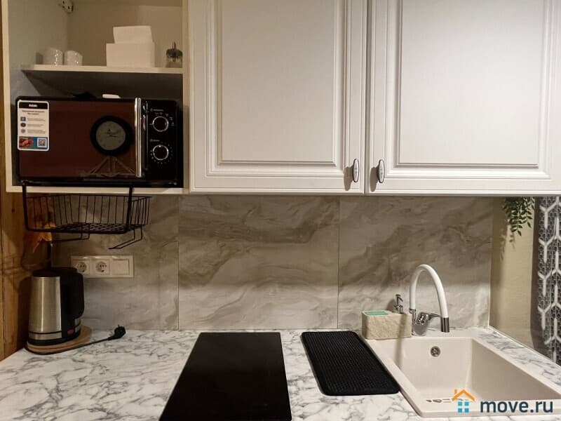 - удобная обеденная и кухонная зона с набором посуды, плитой, микроволновой печью