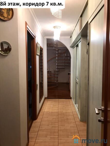 Площадь 8го этажа квартиры 61 кв.м. с учетом балкона. Комната 23 кв.м. (диван, настенные полки, столик, зеркало, люстра) с выходом на балкон 1,8 кв.м. и лестницей на чердачный этаж, спальня 14,4 кв.м. (кровать, кондиционер, шкаф, комод, люстра) кухня 9,7 кв.м. (кухонный гарнитур, плита холодильник, телевизор, лампа настенная, стол, стулья), коридор 7 кв.м. (встроенный шкаф-купе), душевая 4,1 кв.м. (душевая кабинка, зеркало, раковина).