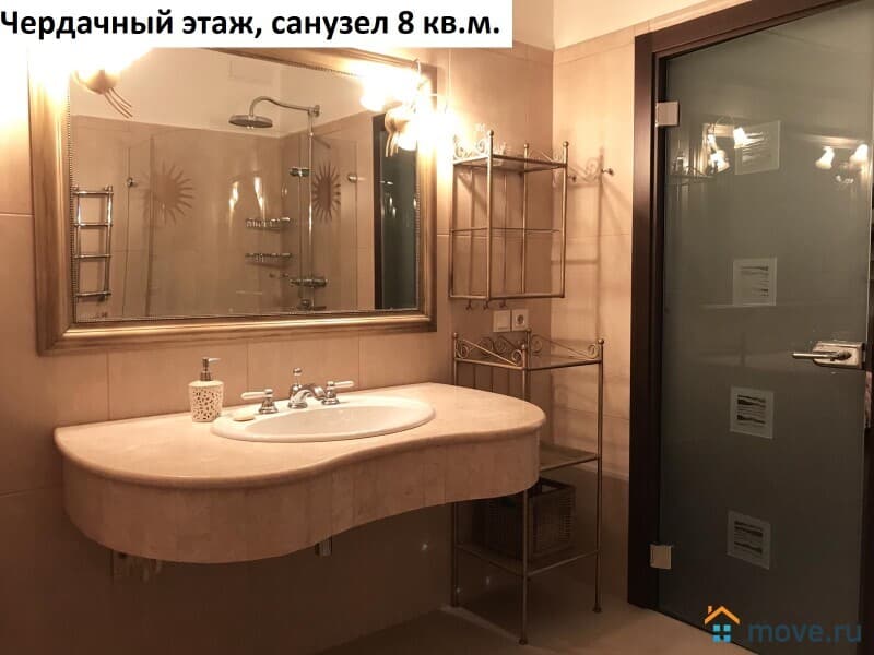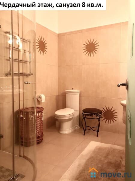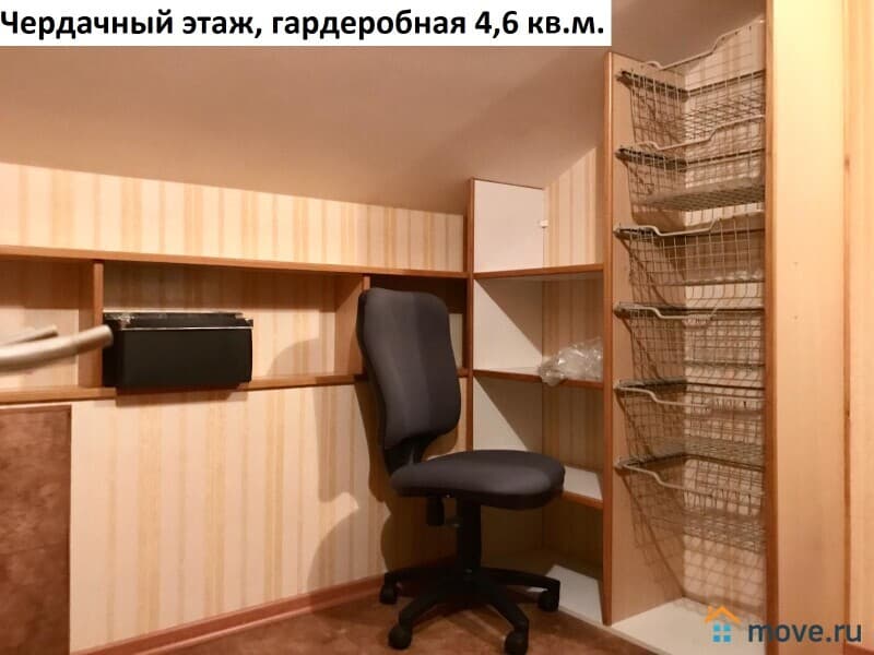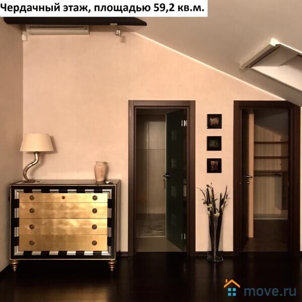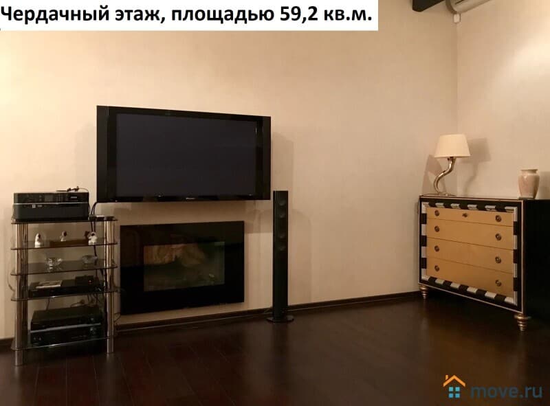 Площадь чердачного этажа квартиры 59,2 кв.м. Единое, открытое пространство, состоящее из спальни (телевизор, кровать 2 метра, фирменный матрас, комод, полки, люстра), санузла 8 кв.м. (душевая кабинка, раковина, зеркало, полки) и гардеробной 4,6 кв.м. (стиральная машинка, офисный стул, полки).