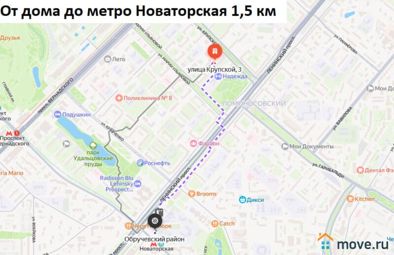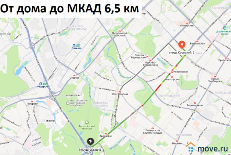Удобная транспортная доступность: от дома до автобусной остановки 300 метров. 1,5 километра до метро Новаторская и метро Университет, 1,8 километра до метро Проспект Вернадского, 6,5 километров до МКАД.