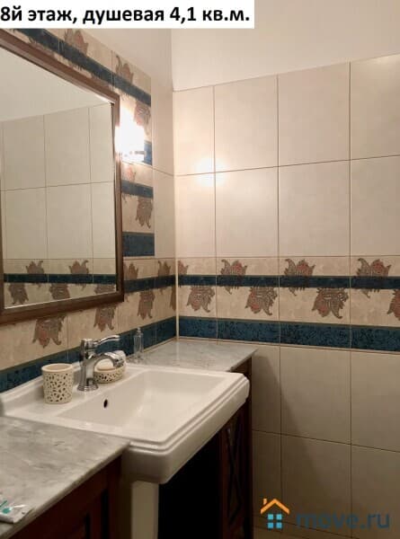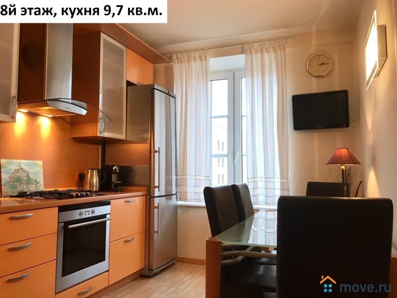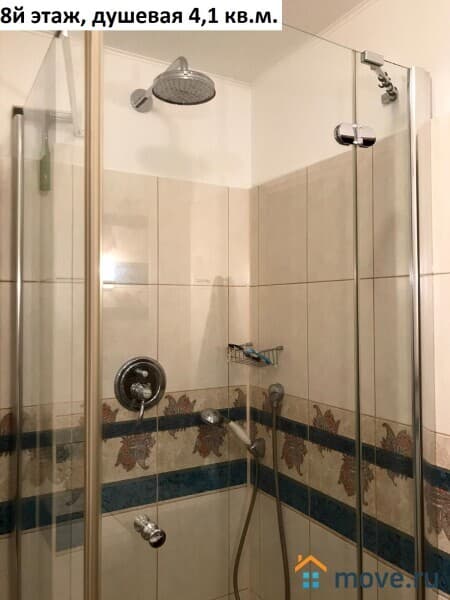 Площадь 8го этажа квартиры 61 кв.м. с учетом балкона. Комната 23 кв.м. (диван, настенные полки, столик, зеркало, люстра) с выходом на балкон 1,8 кв.м. и лестницей на чердачный этаж, спальня 14,4 кв.м. (кровать, кондиционер, шкаф, комод, люстра) кухня 9,7 кв.м. (кухонный гарнитур, плита холодильник, телевизор, лампа настенная, стол, стулья), коридор 7 кв.м. (встроенный шкаф-купе), душевая 4,1 кв.м. (душевая кабинка, зеркало, раковина).