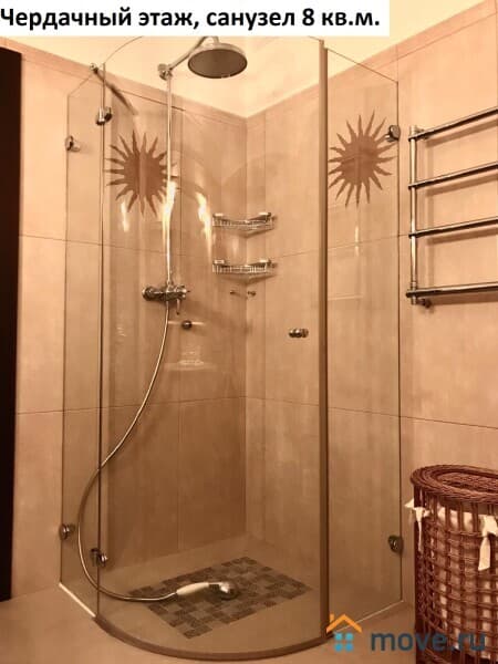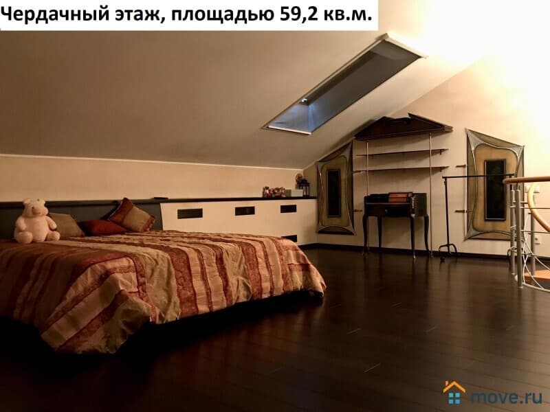 Площадь чердачного этажа квартиры 59,2 кв.м. Единое, открытое пространство, состоящее из спальни (телевизор, кровать 2 метра, фирменный матрас, комод, полки, люстра), санузла 8 кв.м. (душевая кабинка, раковина, зеркало, полки) и гардеробной 4,6 кв.м. (стиральная машинка, офисный стул, полки).
