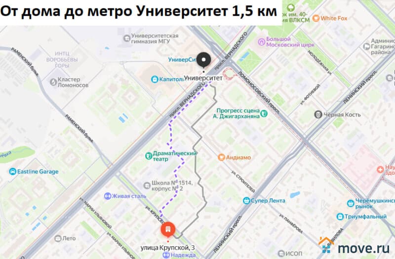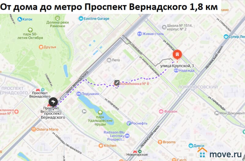 Удобная транспортная доступность: от дома до автобусной остановки 300 метров. 1,5 километра до метро Новаторская и метро Университет, 1,8 километра до метро Проспект Вернадского, 6,5 километров до МКАД.