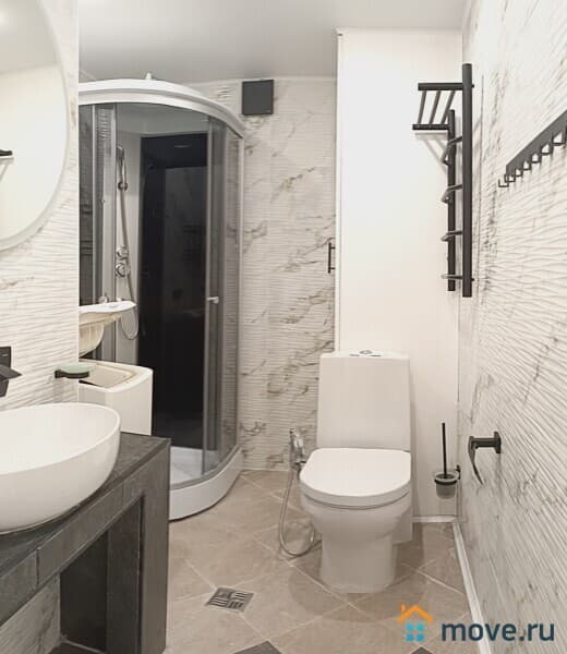 2 кондиционера: на кухне и в комнате. Тёплый пол в ванной. 2 больших телевизора. Микроволновка, тостер, чайник.