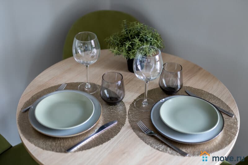 - удобная обеденная и кухонная зона с набором посуды, плитой, микроволновой печью