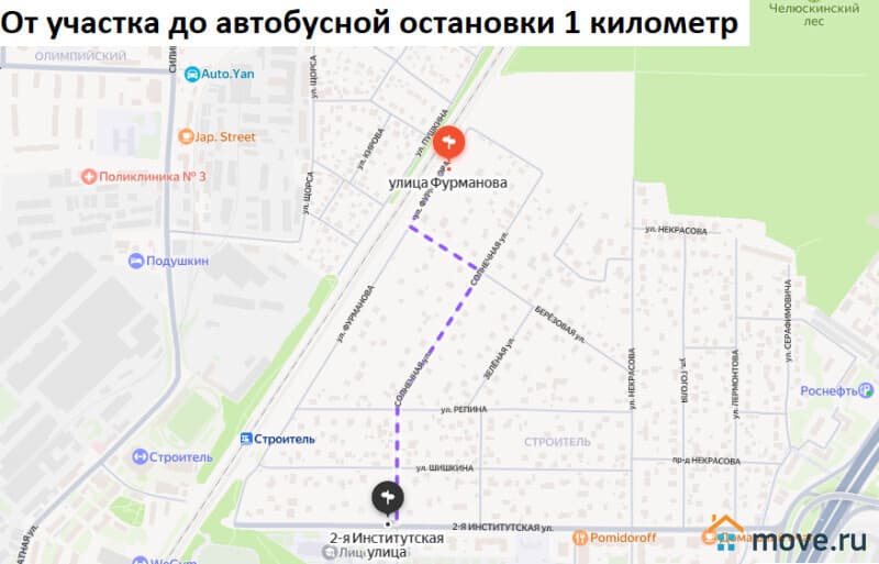 В 100 м от участка Челюскинский лес, весь посёлок в вековых соснах. Рядом (в шаговой доступности) вся городская инфраструктура: магазины, супермаркеты, кафе, рестораны, салоны красоты, отделения банков, поликлиники, детские сады, школы и т.п. В 15 минутах пешком находится одна из лучших в Подмосковье школ: "Лицей 15". Так же рядом филиал МГТУ им. Баумана, бывший "ЛесТех". Территория посёлка огорожена и охраняется, дороги освещены.