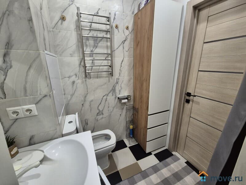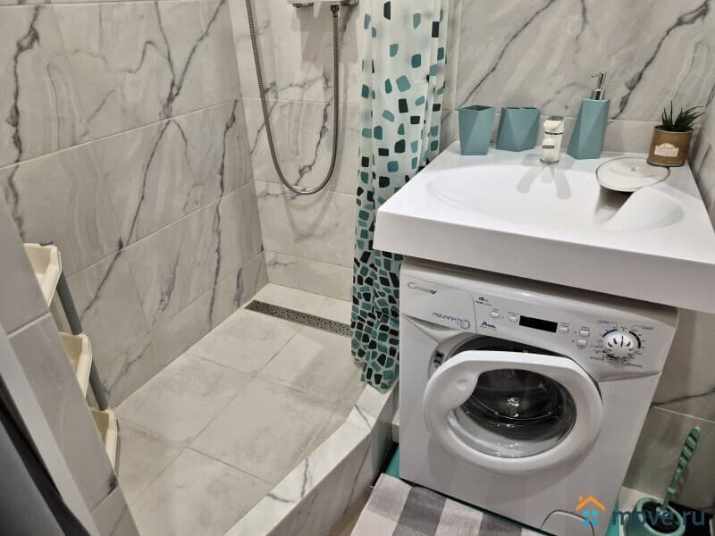 В ванной стиральная машина, туалетные принадлежности, сушилка для белья, фен, утюг.
