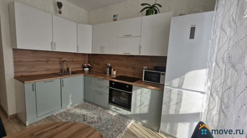 Из техники: холодильник Haier, варочная панель Electrolux Platinum, духовой шкаф Haier, вытяжка Maunfeld, посудомоечная машина Haier.