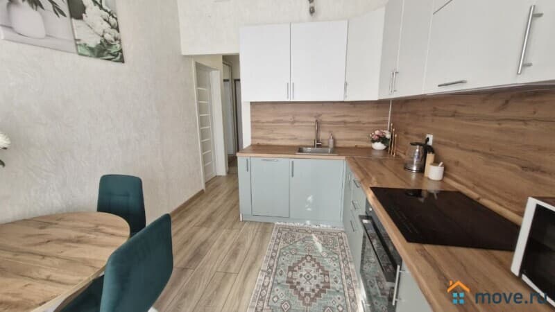Кухня оборудована современной функциональной мебелью: фасады в фисташково-белой гамме, столешница и фартук — под дерево (дуб), доводчики на дверцах. Установлен раздвижной обеденный стол и 4 стула.