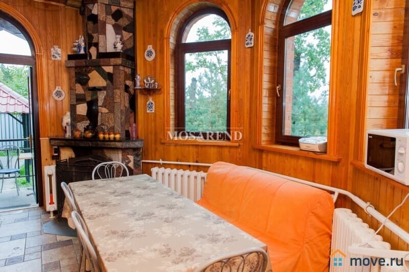 -1 этаж: банкетный зал на 15 человек (за отдельную плату предоставляем скатерти и чехлы на стулья), диваны, ТВ и аудиоаппаратура, комната отдыха с камином, кухня с бытовой техникой и посудой, туалет, просторная душевая, парная