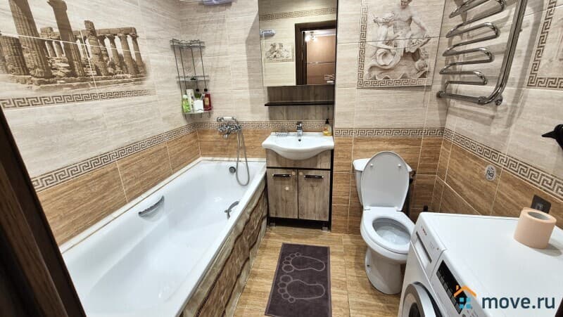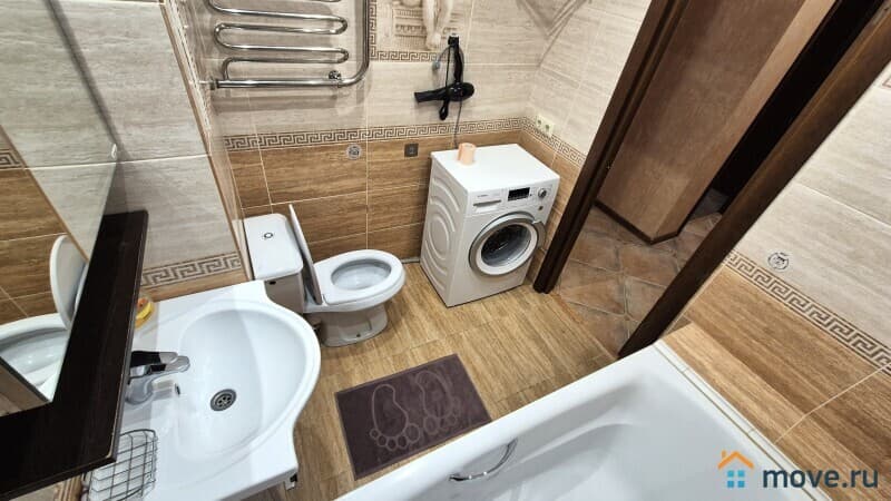 В ванной стиральная машина, полотенца, тапочки, туалетные принадлежности.