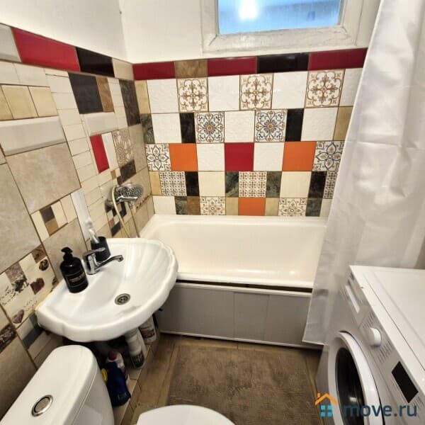 В ванной стиральная машина, полотенца, тапочки, туалетные принадлежности.