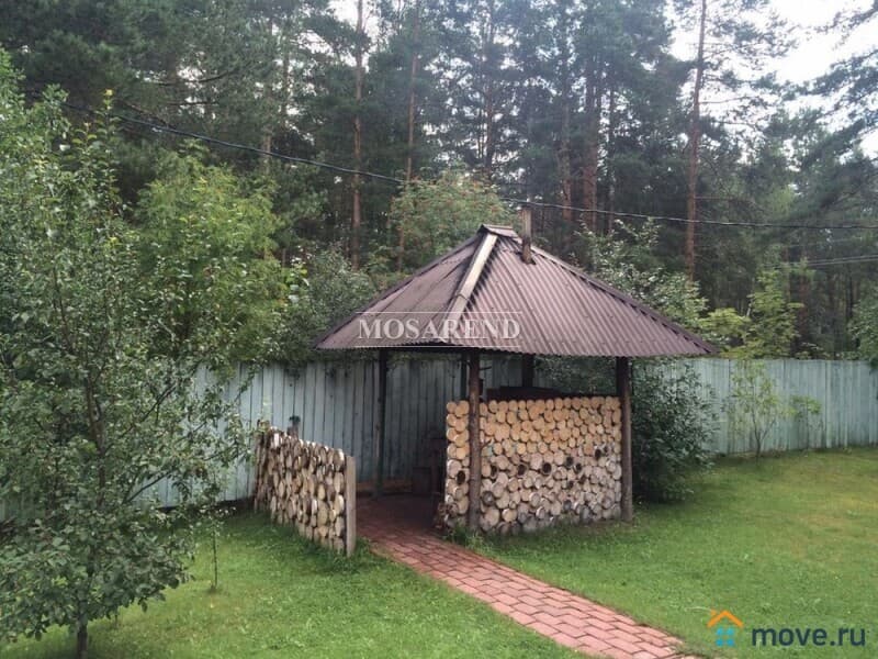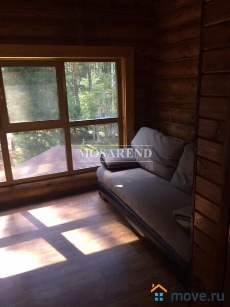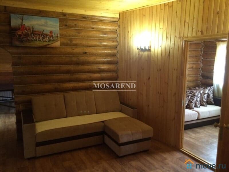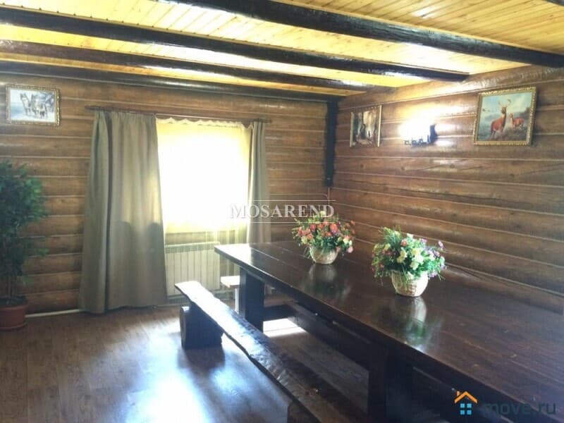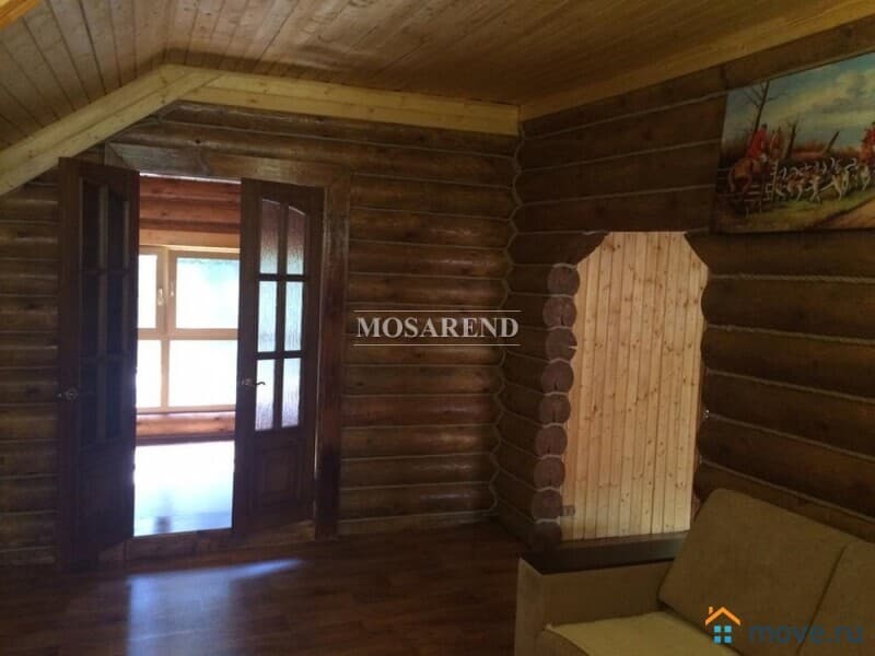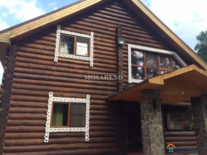 Коттедж площадью 360 м2 из оцилиндрованного бревна расположен в живописном сосновом бору в 98 км от МКАД по Егорьевскому шоссе.
