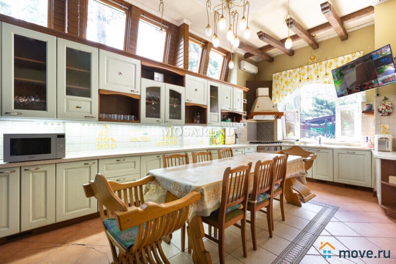 - кухня с бытовой техникой (духовка, холодильник, микроволновка, чайник, кофемашина, посудомойка), обеденный стол на 12 персон