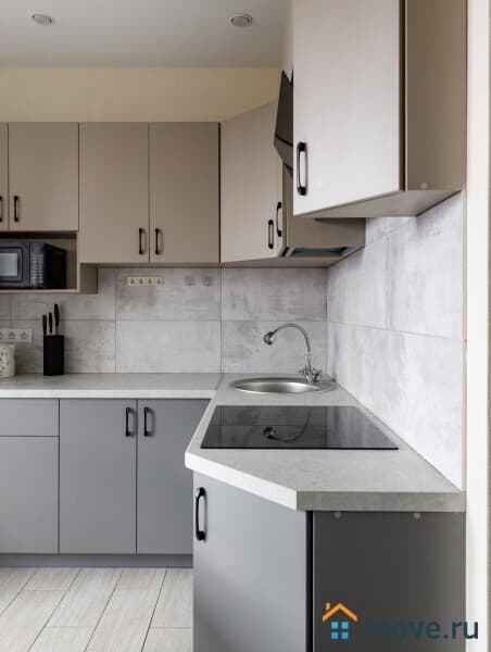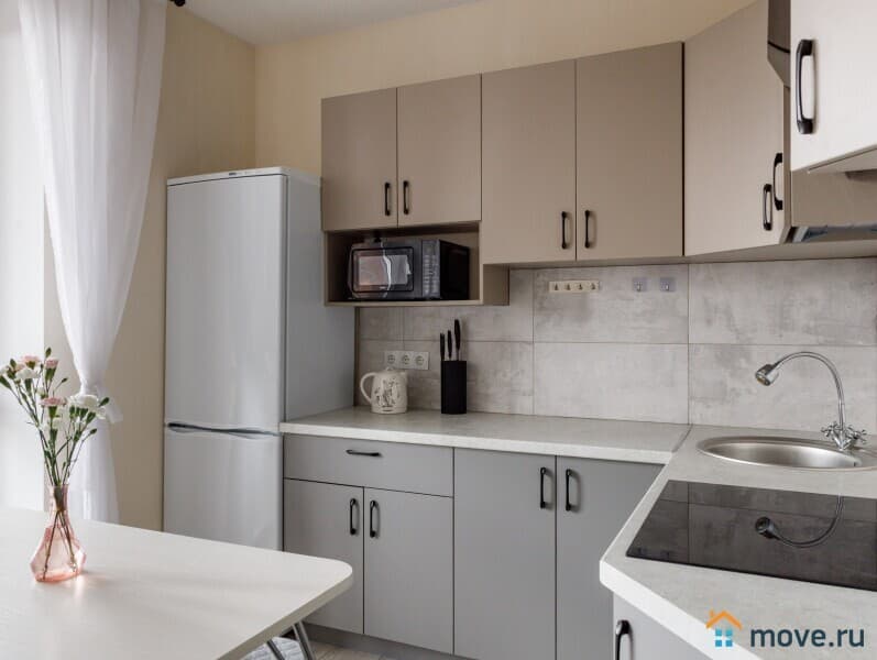 оборудованная кухня с необходимыми кухонными принадлежностями, посудой и техникой