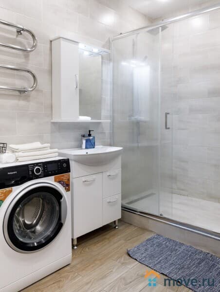 ванная комната с душевой, полотенцами, гигиенической косметикой, феном для волос
