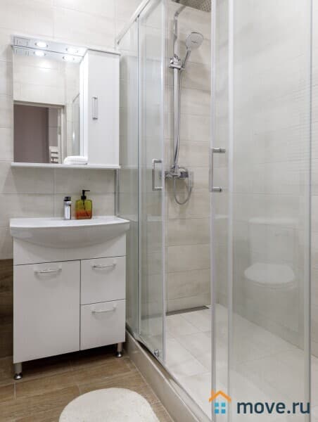 ванная комната с душевой и полотенцами, гигиенической косметикой, феном для волос