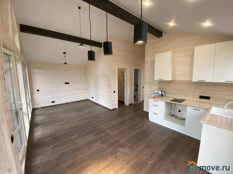 - просторная кухня - гостиная с панорамными окнами и выходом на веранду. Установлен кухонный гарнитур, варочная панель и раковина со смесителем;