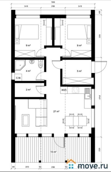 - 2 спальни по 9 кв.м.с панорамными окнами;