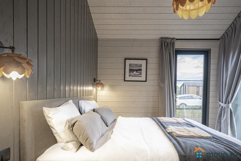 главная спальня с кроватью DBL, где утро начинается с солнечных бликов на деревянных стенах;