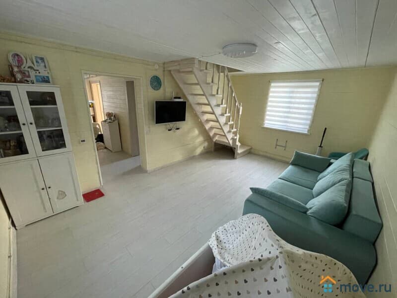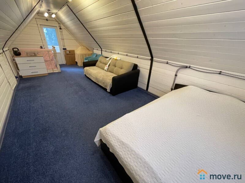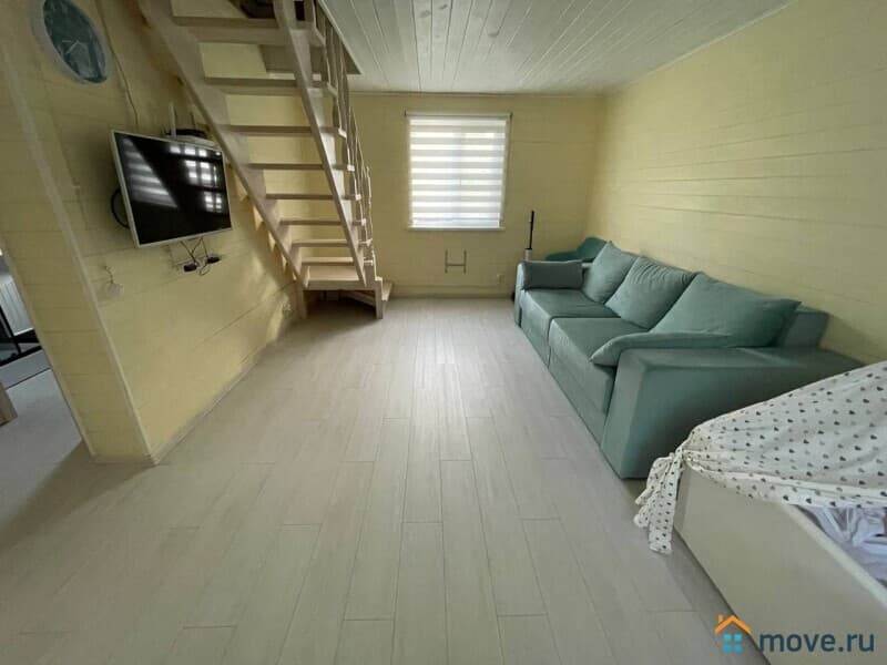 На первом этаже: прихожая, кухня, спальня (детская), санузел, гостиная. На втором этаже 1 большая комната с диваном и двуспальной кроватью + балкон с видом на лес.