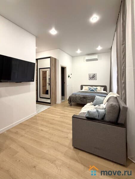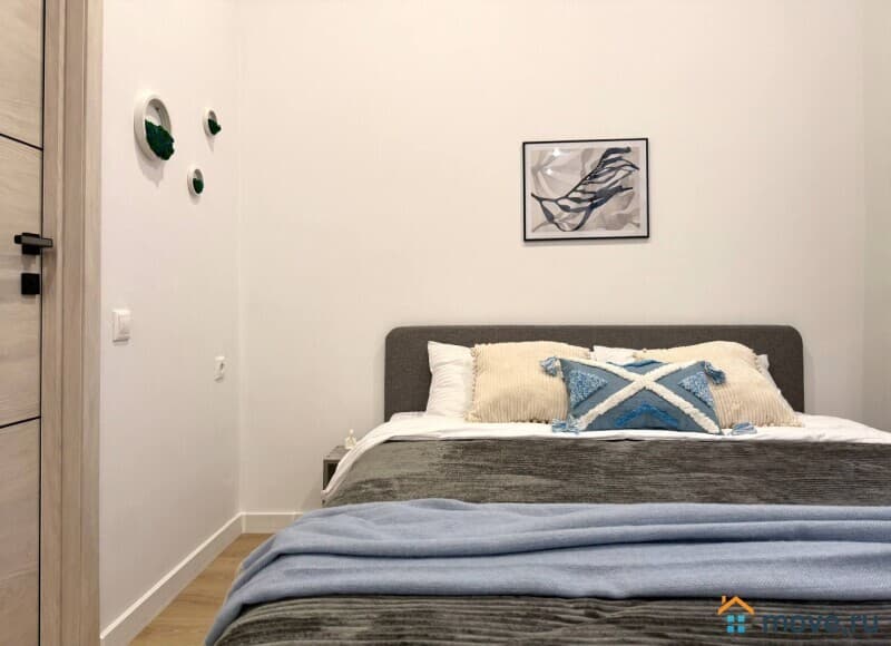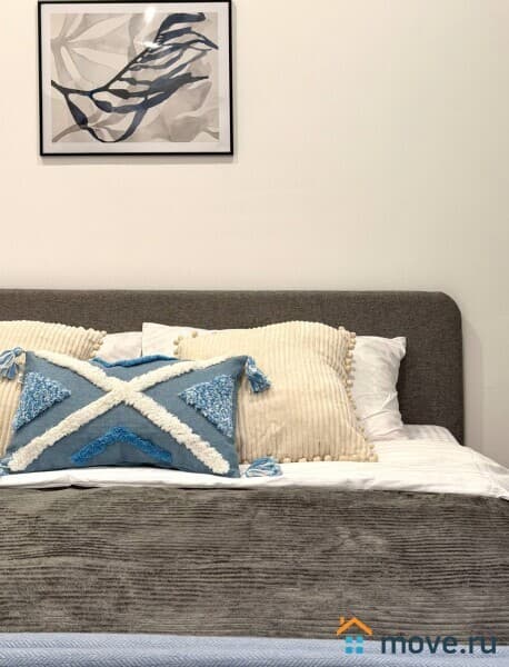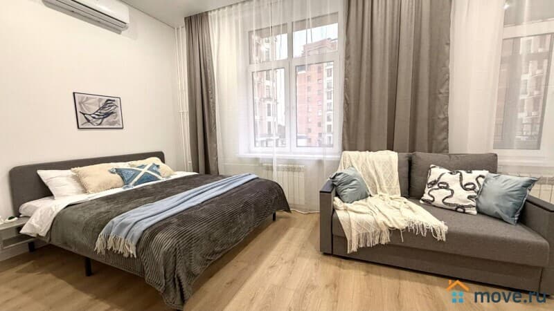 - Двуспальная кровать зaстeлена пocтельным бельем и двуспальный диван