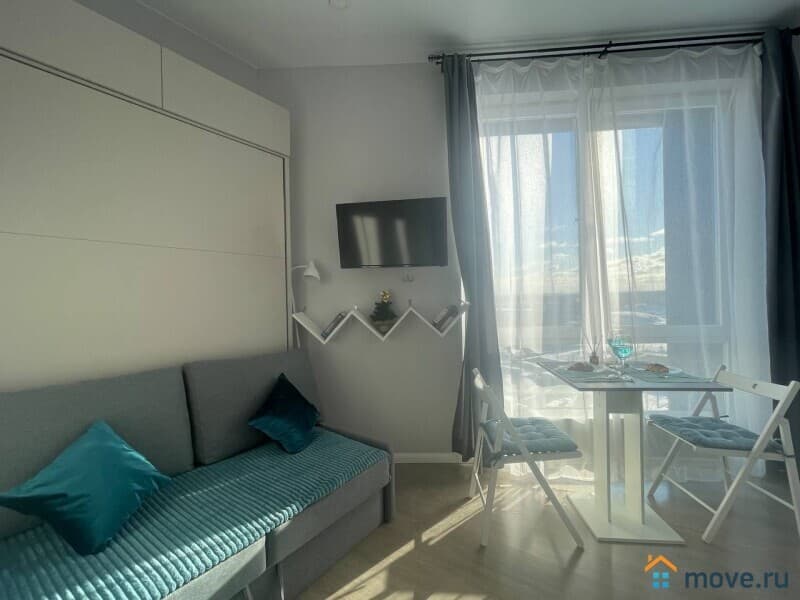 • Двуспальная кровать с ортопедическим матрасом превращается в диван для увеличения комфорта в студии.