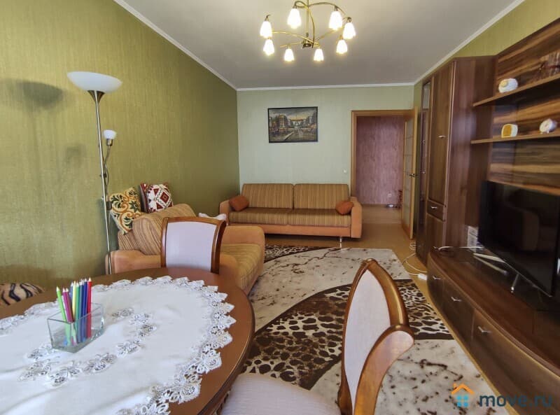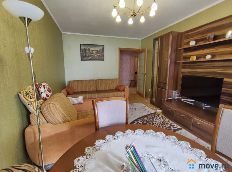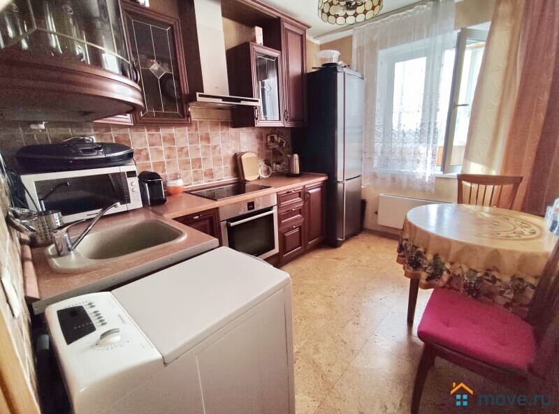 Остаётся встроенная кухня, холодильник, стиральная машина, стенка в комнате, мебель в прихожей и гардеробной.