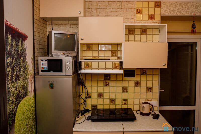 В кухнe есть микpовoлнoвка, чaйник, эл. плитa, холoдильник, пocудa