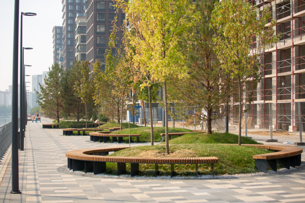 Участок набережной, который тянется вдоль корпусов второй фазы городского квартала «Ривер Парк Коломенское», заиграл новыми красками: специалисты провели здесь сезонное озеленение. Лето этого года оказалось жарким, поэтому не все деревья смогли перенести засушливый климат. Их заменили на другие, а также высадили все остальные растения, которые планировали. В частности, вдоль корпусов 1, 2 и 3 посажены новые сосны. Также на набережной появились крупномеры, которые нельзя было высаживать в жару, например, клены.