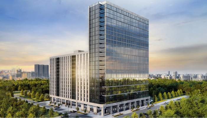 У проекта также сравнительно небольшой масштаб. Общая площадь застройки займет меньше 38 тыс. кв. м. В высоту комплекс достигает 28 этажей. Отделка апартаментов застройщиком не планируется. На первом этаже предусмотрены кафе и рестораны, коворкинг, офисы в аренду, а в парке для работы можно найти уличный коворкинг.