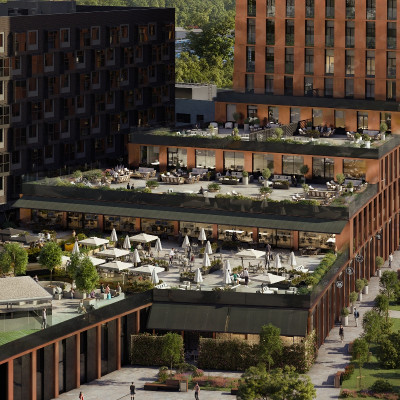 Терраса напоминает английский (хаотичный) парк, озелененный вересковыми растениями и крупномерами в дизайнерских кашпо. Мощение территории для отдыха сотрудников и гостей бизнес-центра будет выполнено изысканной каменной плиткой. Пространство зонировано на перехватывающие места и комфортабельный коворкинг.