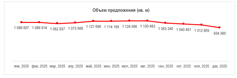 При этом несмотря на выход в реализацию новых проектов, объем предложения к концу года снизился на 15% и составил 934,4 тысячи кв. м против 1,08 млн. кв. м в январе 2025 г.