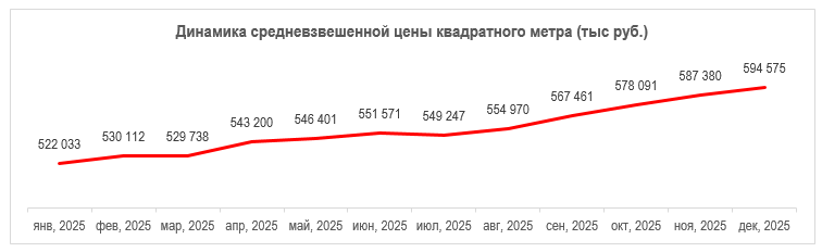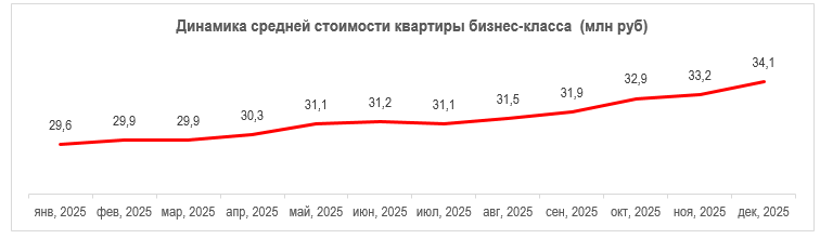 Средняя стоимость квартиры бизнес-класса на первичном рынке Москвы за год выросла на 15%.Планомерный рост цен продолжался на протяжении всего периода. Если в январе 2025 г. средняя стоимость квартиры была порядка 29,6 миллионов рублей, то к концу года она составила уже 34,1 миллион рублей.