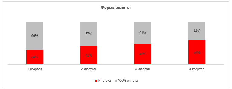 Доля ипотечных сделок в 4-м квартале впервые превысила показатели 100% оплаты и рассрочки и вышла на уровень 56%, показав 22% рост с начала года.